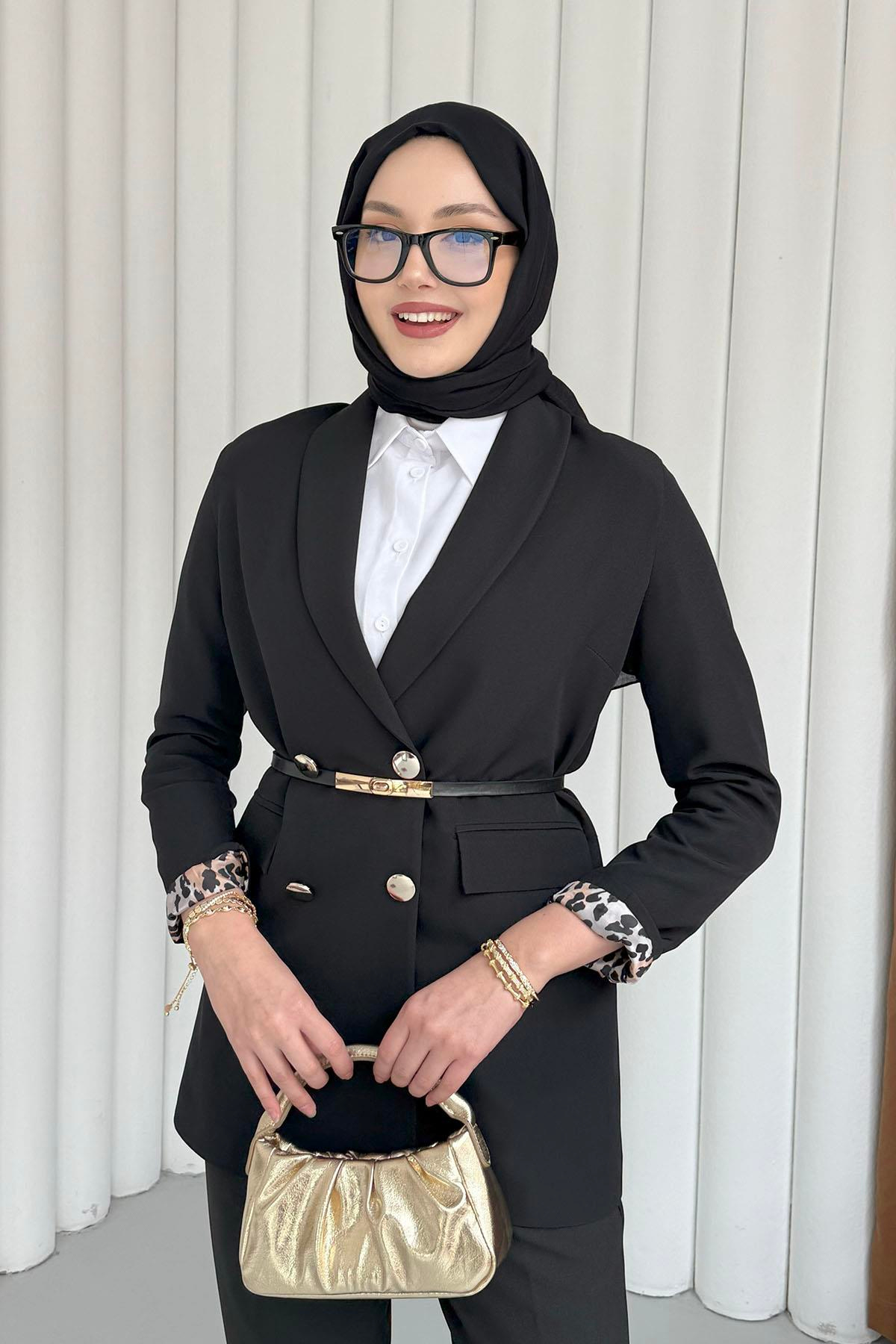 Şal Yaka Astarı Leopar Kruvaze Yaka Ceket-SİYAH (1156)