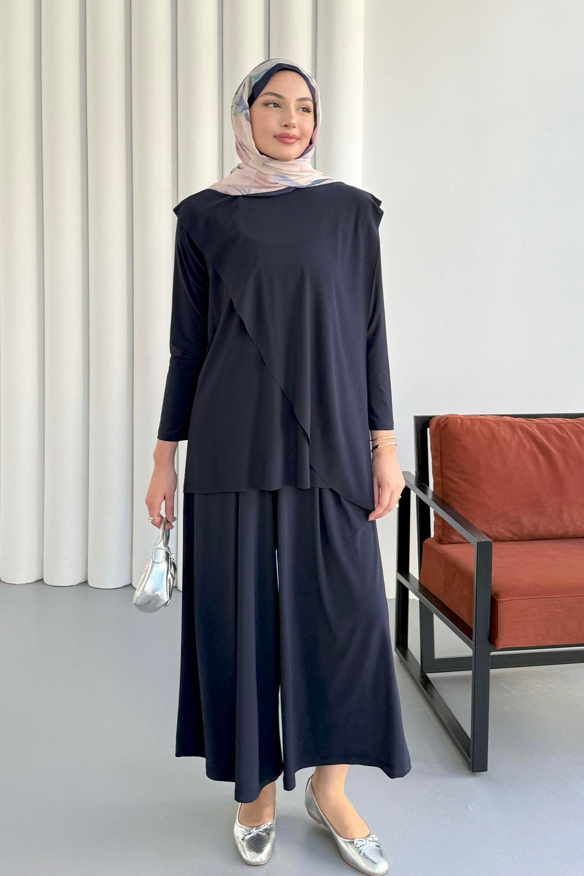 Sandy Kumaş Asimetrik Pantolonlu Tesettür Takım-LACİVERT (22746)