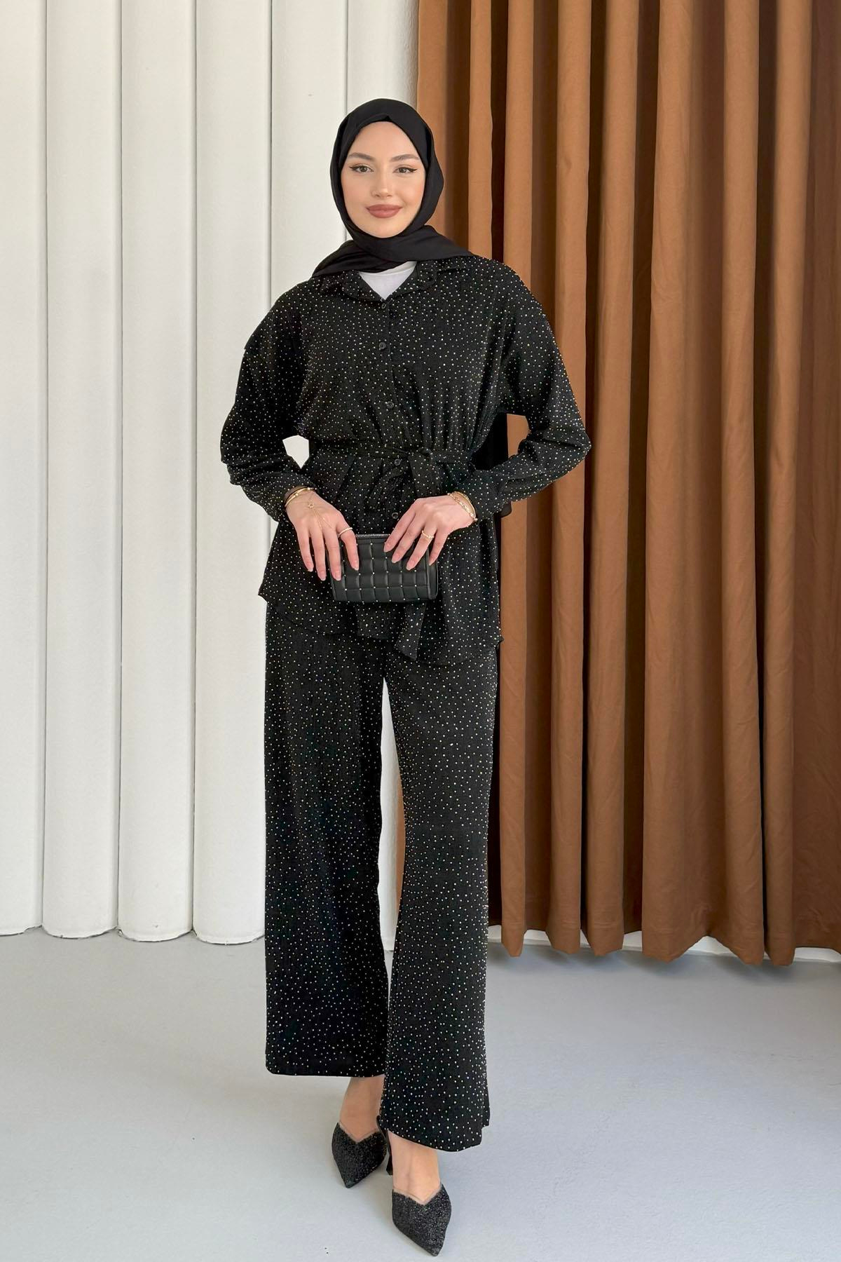 Simli Taş Detaylı Işıltılı Tesettür Takım-SİYAH (5249)
