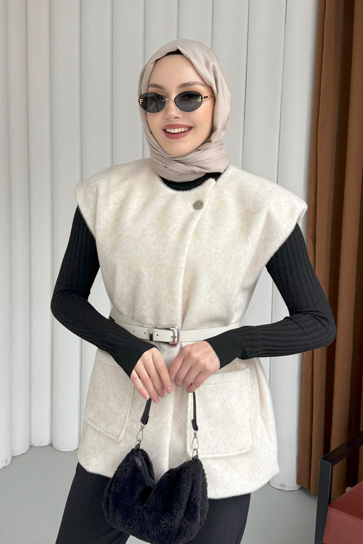Tek Düğme Detaylı Polarlı Yelek-EKRU (3031)
