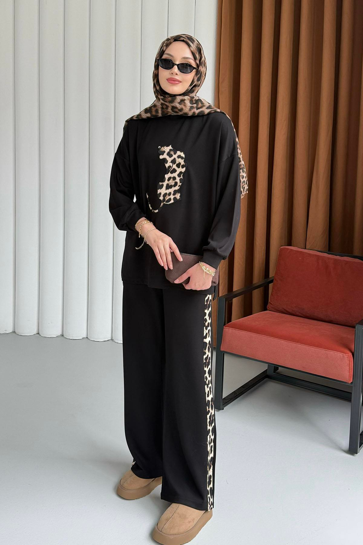 Yandan Leopar Şeritli Pantolonlu Tesettür Takım-SİYAH (8931)