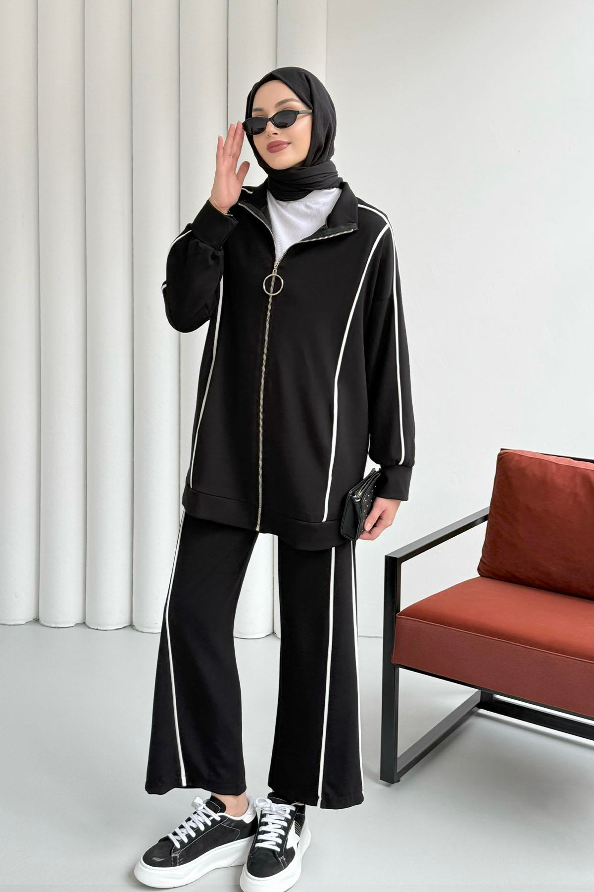 Yanlardan Şerit Detaylı Fermuarlı Tesettür Takım-SİYAH (22762)