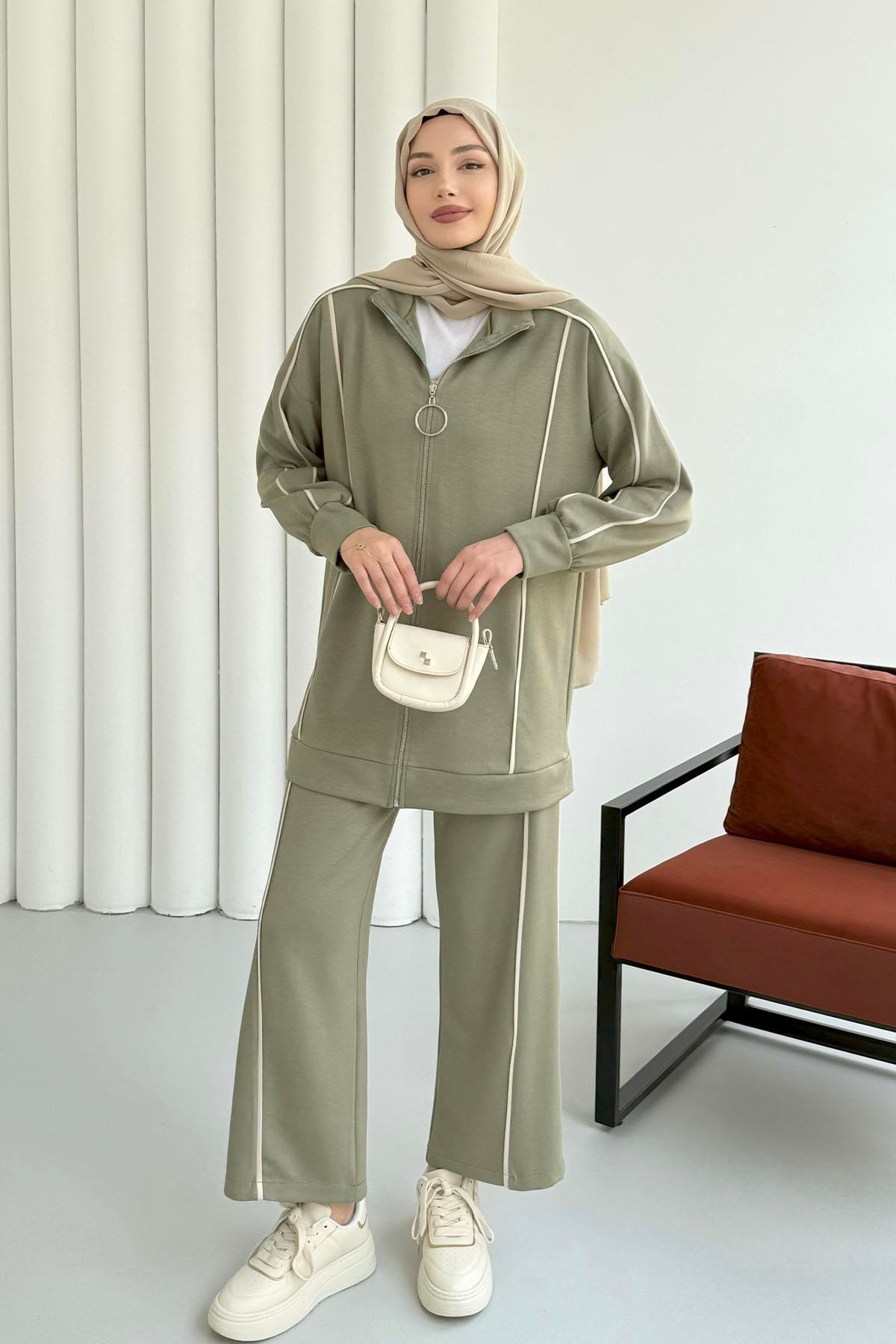 Yanlardan Şerit Detaylı Fermuarlı Tesettür Takım-YEŞİL (22762)