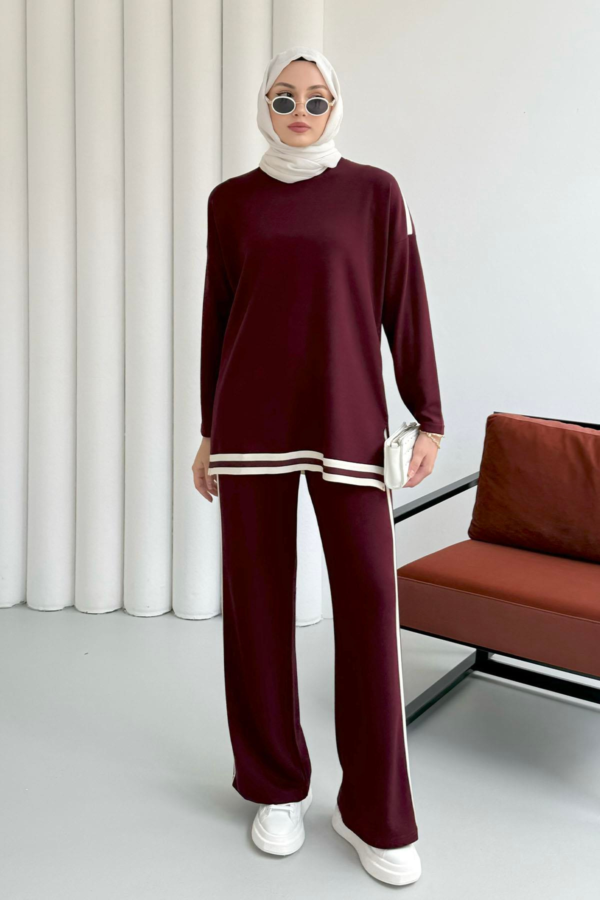 Yanlardan Şerit Detaylı Tesettür Takım-BORDO (8915)