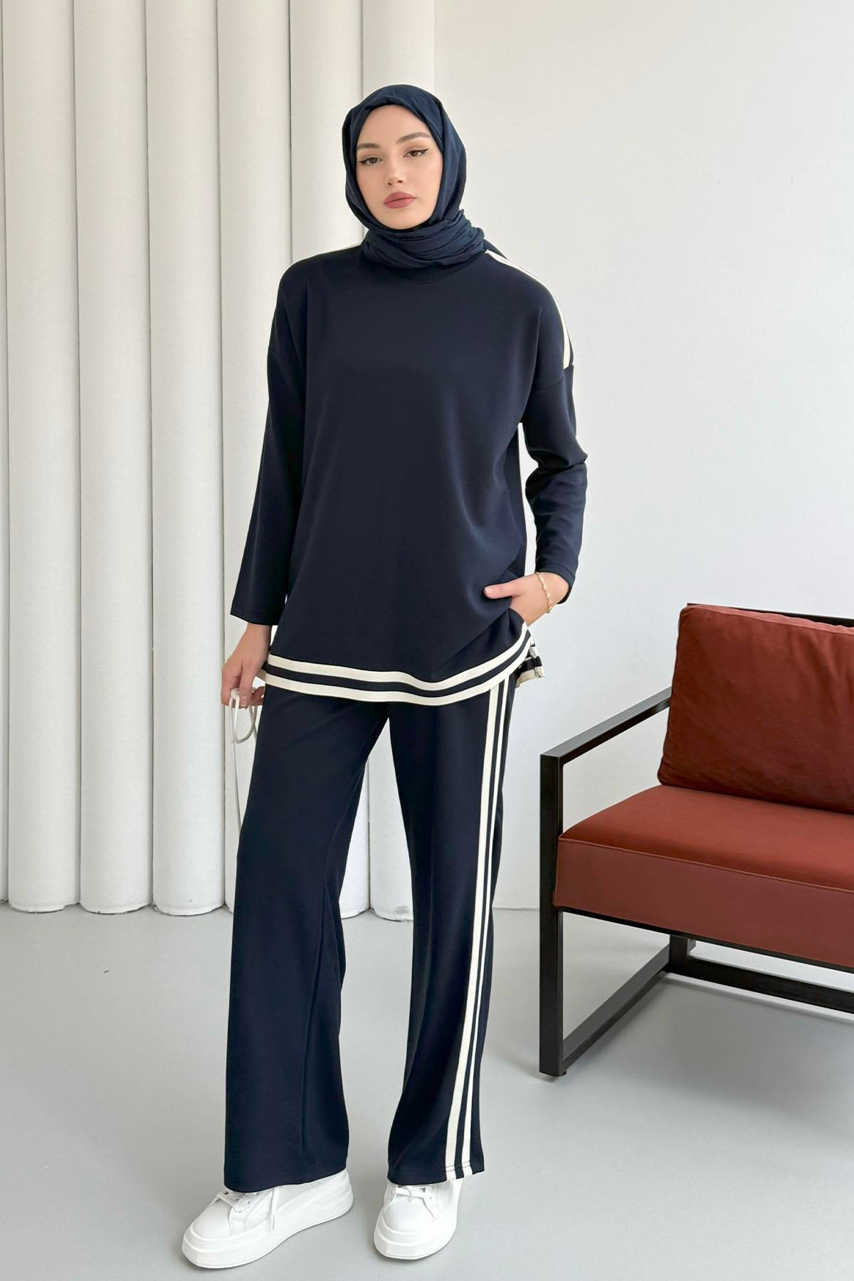 Yanlardan Şerit Detaylı Tesettür Takım-LACİVERT (8915)