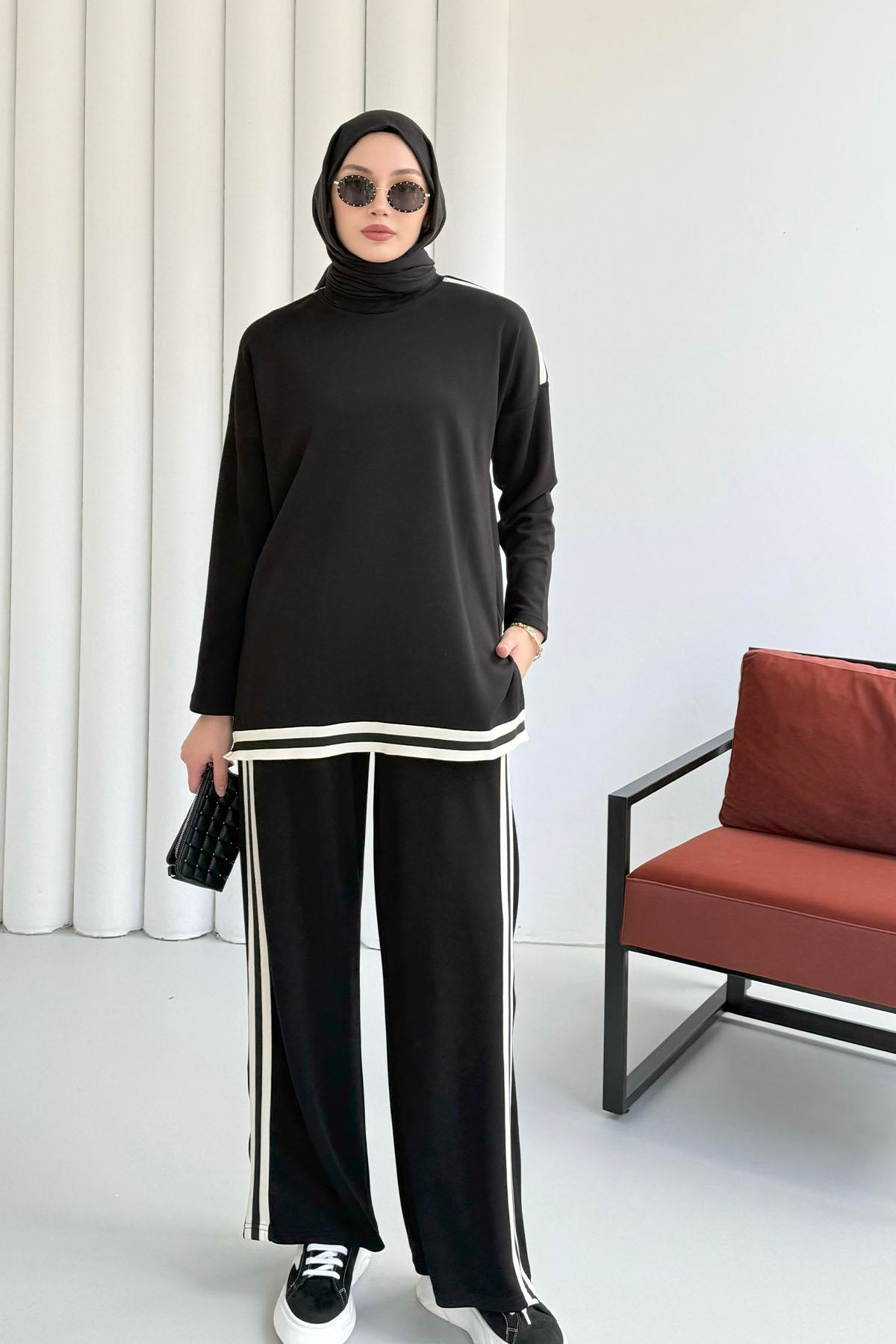 Yanlardan Şerit Detaylı Tesettür Takım-SİYAH (8915)