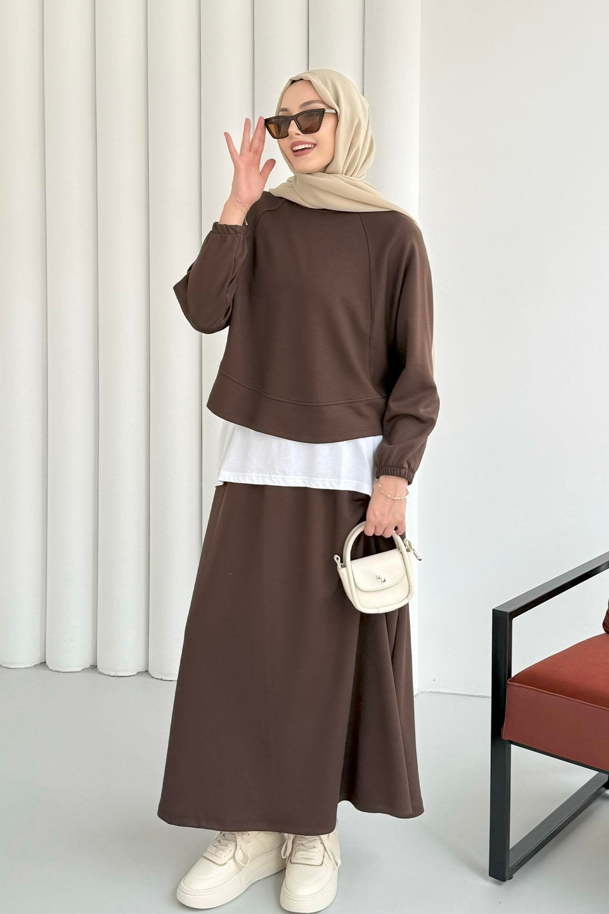 Yarasa Kol Almera Etekli Tesettür Takım-KAHVERENGİ (22779)