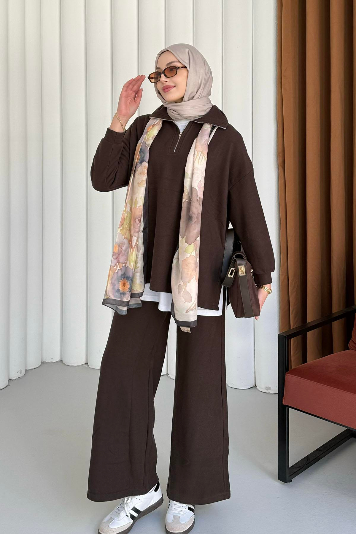 Yarım Fermuarlı Selanik Kumaş Pantlonlu Tesettür Takım-KAHVERENGİ (52833)