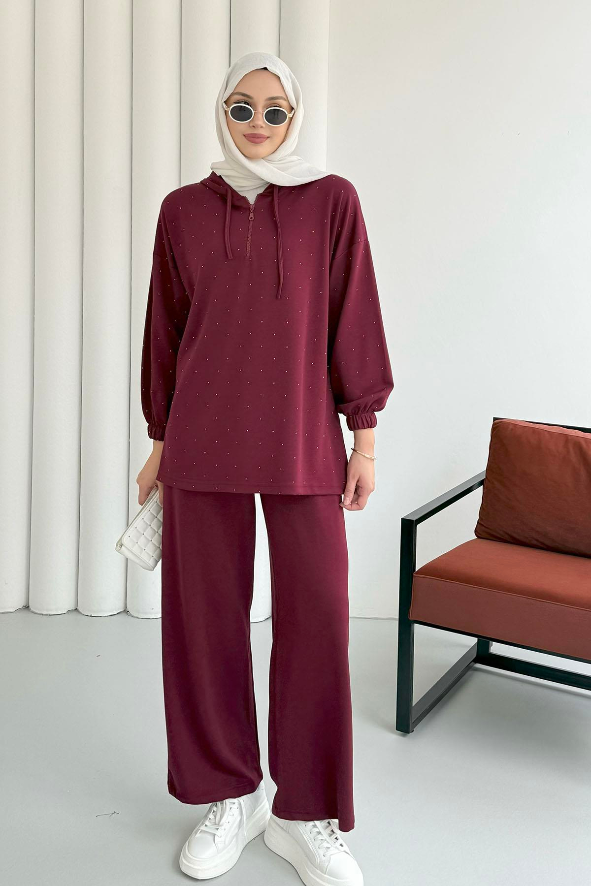 Yarım Fermuarlı Üst Taşlı Pantolonlu Tesettür Takım-BORDO (3009)