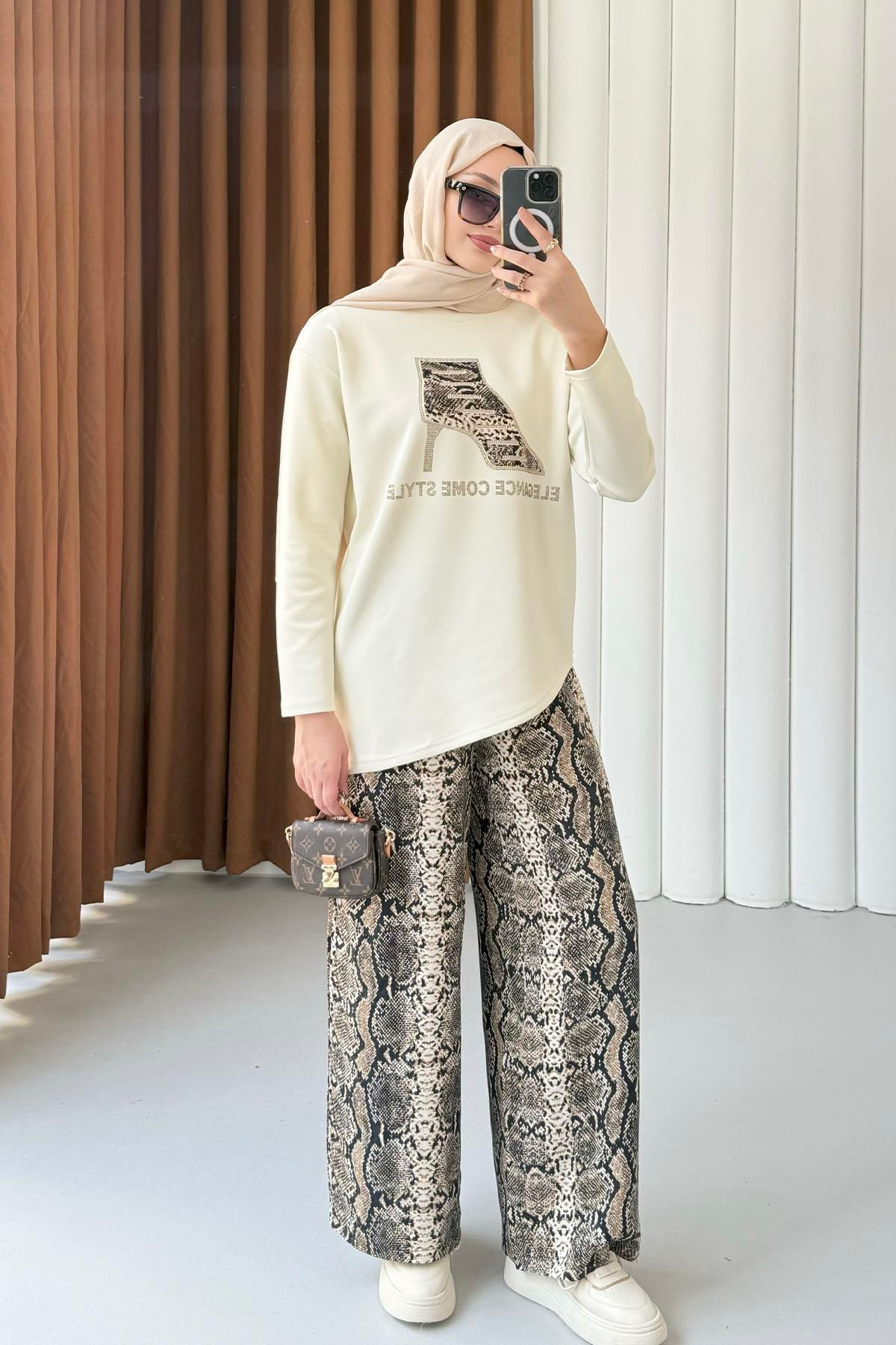 Yazı Baskılı Asimetrik Kesim Pantolonlu Tesettür Takım-EKRU (5255)