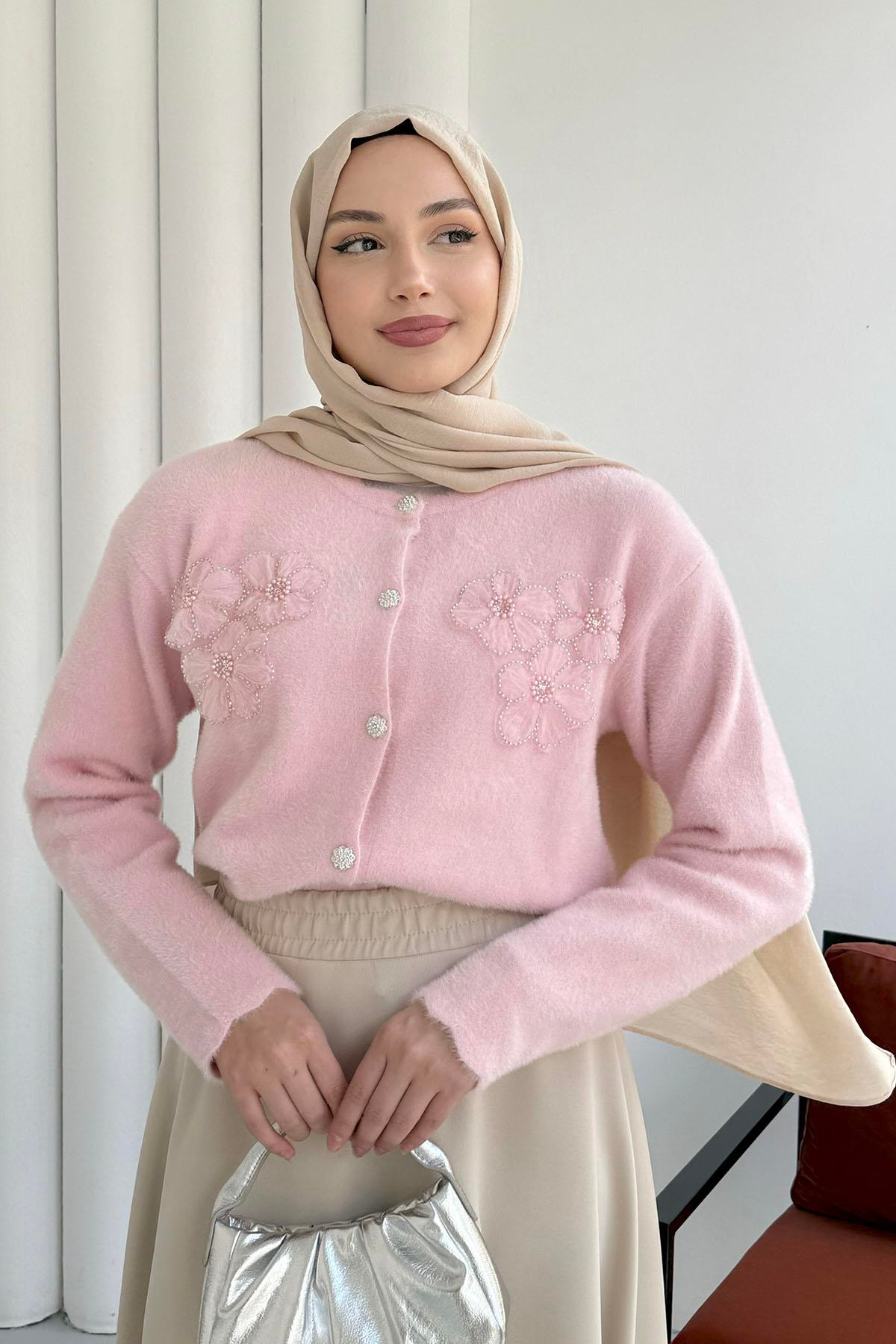 Yumoş Dokulu Çiçek Detaylı Triko Hırka-PEMBE (2634)