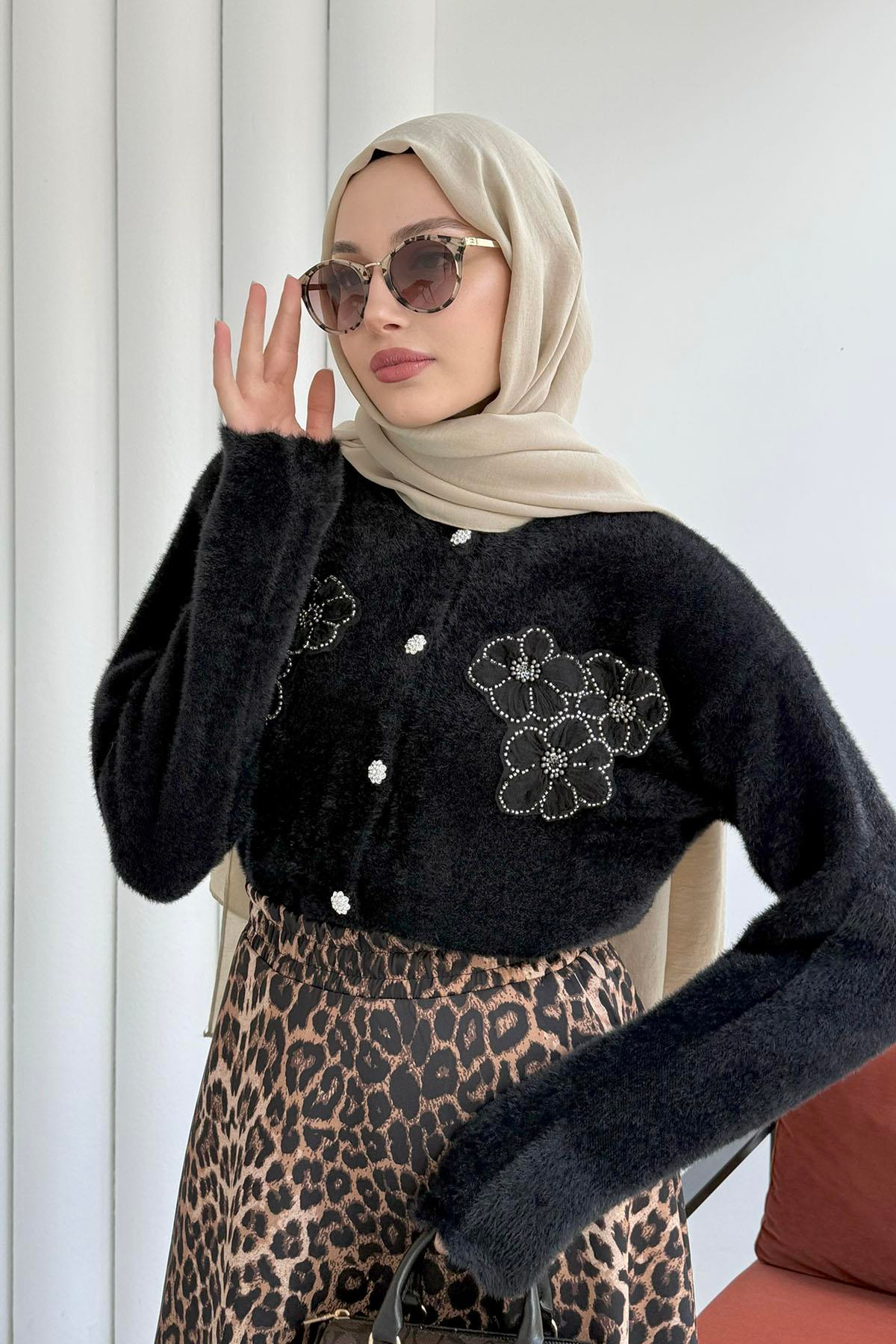 Yumoş Dokulu Çiçek Detaylı Triko Hırka-SİYAH (2634)